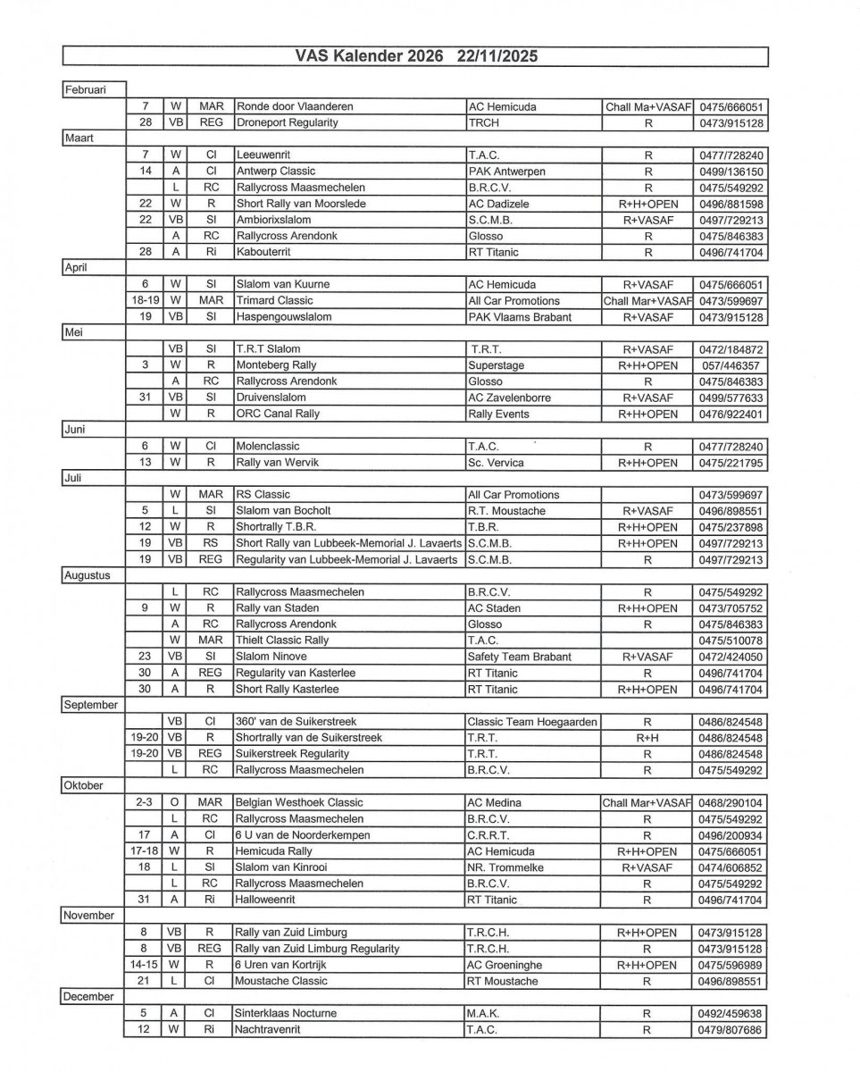 Vandaag werd de voorlopige VAS kalender bekendgemaakt, en daar zijn enkele opvallende data. Zo zien we de terugkomst van de Short Rally van de Suikerstreek en zal er in Lubbeek een Short Rally zijn in plaats van een Rallysprint.