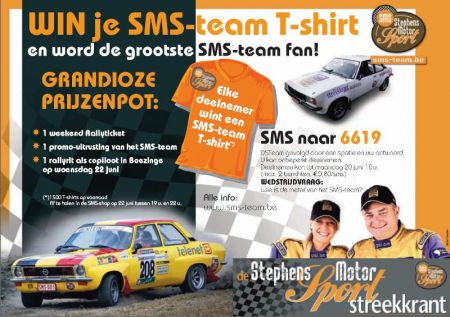 Ondertussen kan iedereen danzij SMS en De Streekkrant deelnemen aan een wedstrijd. Er zijn mooie prijzen te winnen, en iedere deelnemer kan rekenen op een T-Shirt van het SMS team... Meer info op www.sms-team.be.